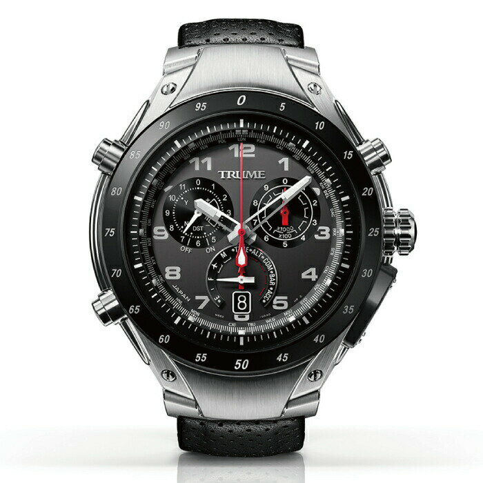 TRUME -L collection- 品番 TR-MB8005 駆動 ライトチャージGPS衛星電波修正 ケース材質 チタン(ベゼル部:セラミック) ケースコーティング プロテクトコーディング(表面硬化処理) バンド材質 レザー バンド幅(かん幅) 20mm ガラス材質 サファイアガラス ガラスコーティング SARコーティング(両面無反射コーティング) 蓄光 ルミナスライト(針・インデックス) サイズ 縦60.2mm×横48.6mm×厚さ15.5mm(ボタン・りゅうず含まず) 重量 約110g 手首同長 レザーバンド:150mm〜195mm 精度 平均月差:±15秒 電池 リチウムイオン二次電池 駆動時間 約6ヶ月:フル充電でパワーセーブが作動せず且つ充電もしない場合 約2年:フル充電でスリープ機能が作動した場合 充電 ライトチャージ 防水 10気圧防水(日常生活用強化防水) 内蔵センサー GPSセンサー/気圧・高度センサー/方位センサー 無線通信 Bluetooth(エクスパンデッドセンサーとの通信のみ可) 動作温度 -10℃〜+60℃ GPS衛星電波受信 タイムゾーン設定機能、自動時刻受信機能、手動時刻受信機能 機内モード設定 無線通信・GPS受信・センサー計測オフ 針位置自動修正機能 ○ スリープ機能 ○ 電池残量表示機能 ○ ワールドタイム機能 全世界39タイムゾーン 29都市 サマータイム(DST) on-off ○ ストップウオッチ 0時0分0秒〜最大99分59.8秒計測(1/5秒単位) 気圧計測 表示:300〜1,100hPa 最小単位:1hPa 気圧傾向 [+],[−](11段階表示) (手動)最大1分間 高度計測 表示:-1,000m〜9,999m 最小単位:1m 方位計測 表示:センター針により北方を指示、偏角補正機能有り 最小単位:1.2° ウェイポイント 距離(基準位置までの)表示:0〜9,900m 最小単位:100m 方位(基準位置の方向)表示:小秒針にて指示 最小単位:6° 方位(北方向)表示:センター針により指示 最小単位:1.2° ログ記録 高度:11件/気圧:11件/UVインデックス・温度・歩数・消費カロリー:合計で11件 パーペチュアルカレンダー機能(日付表示) ○ りゅうず ねじ式りゅうず エクスパンデッドセンサー ケース材質 プラスチック(一部メタル) サイズ 縦54.6mm×横39.3mm×厚さ10mm(クリップ部除く) 重量 約21.0g(電池含む) 表示 LED 電池 CR2032(コイン型リチウム電池) 駆動時間 25℃の環境下にて6ヶ月(使用条件によります) 防水 IPX5 動作温度 -10℃〜+60℃ UVインデックス計測 1〜15 温度計測 -10℃〜+60℃ 歩数計測 0〜99,999歩 消費カロリー計測 0〜9,999kcal 電池交換表示 ○※詳細とお申込み方法はトゥルーム公式サイトにてご確認ください。
